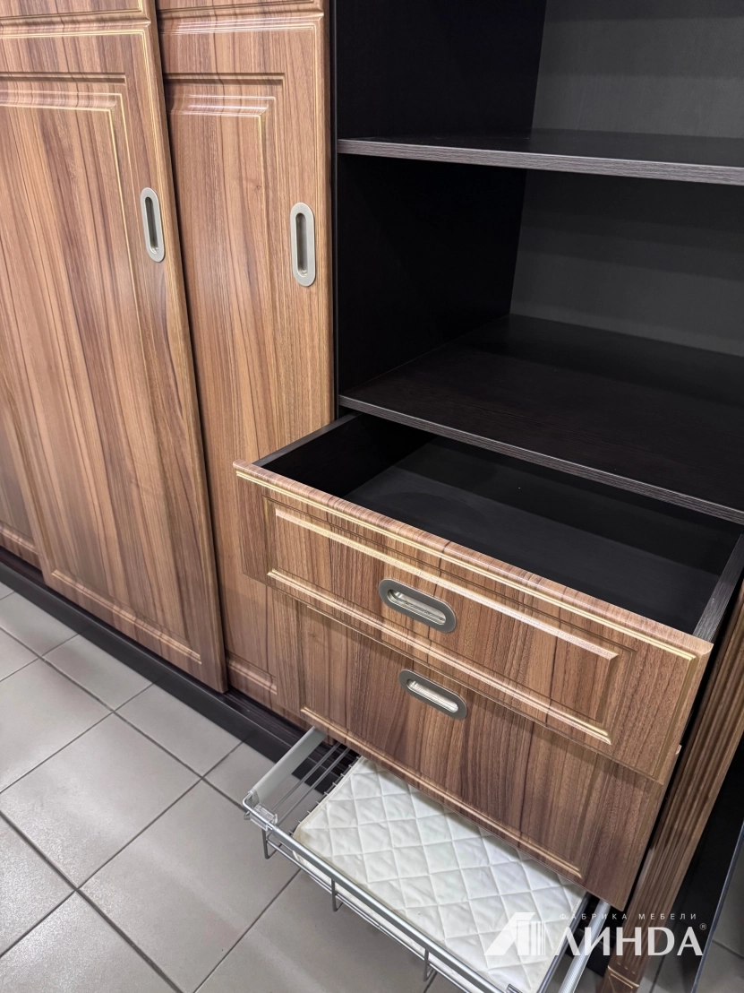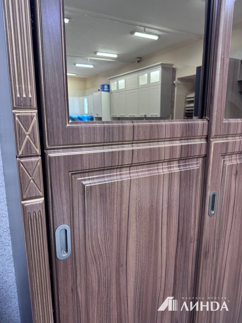 Фасады МДФ с фрезеровкой, «Орех натуральный» с патиной золото, зеркало бронза, корпус ЛДСП Венге.